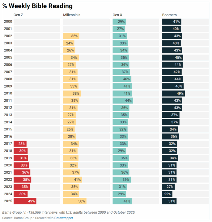 Millennial Bible readers have jumped roughly 16 points in a short span, and about half now report reading weekly. Gen Z has seen similar growth, rising from 30% to nearly 49% in just one year.
