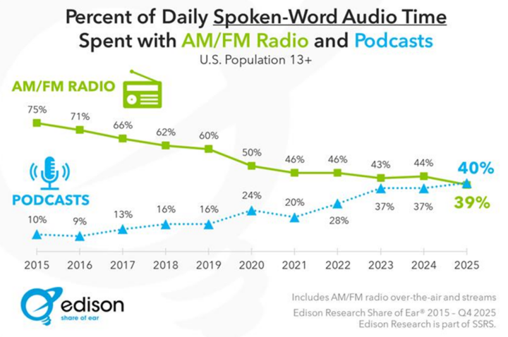 Edison Research’s Share of Ear study, podcasts now account for 40% of daily spoken-word listening time, slightly ahead of AM/FM radio at 39%.