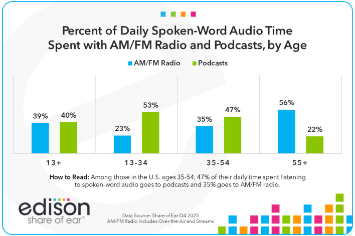 According to Edison Research’s latest Share of Ear data, spoken-word audio listening among people 13+ is nearly evenly split between AM/FM radio (39%) and podcasts (40%).