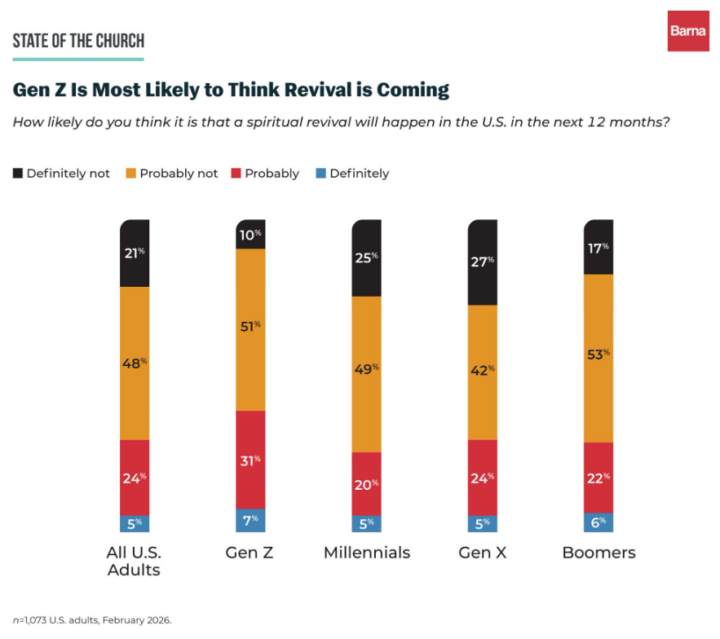 According to new research from Barna, 29% of U.S. adults believe a spiritual revival is likely in the near future, with that number rising to 38% among Gen Z.